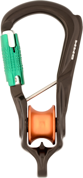 DMM's Revolver Rig is a connector with an integrated pulley sheave. It features a high efficiency roller bearing sheave(s), threaded removable captive bar, and a full strength textile friendly becket. The uniquely profiled spine and removable captive bar aid in maintaining correct orientation. The design of the Revolver Rig is such that when using a connector attached to the becket, any friction between the connector and rope is minimized.