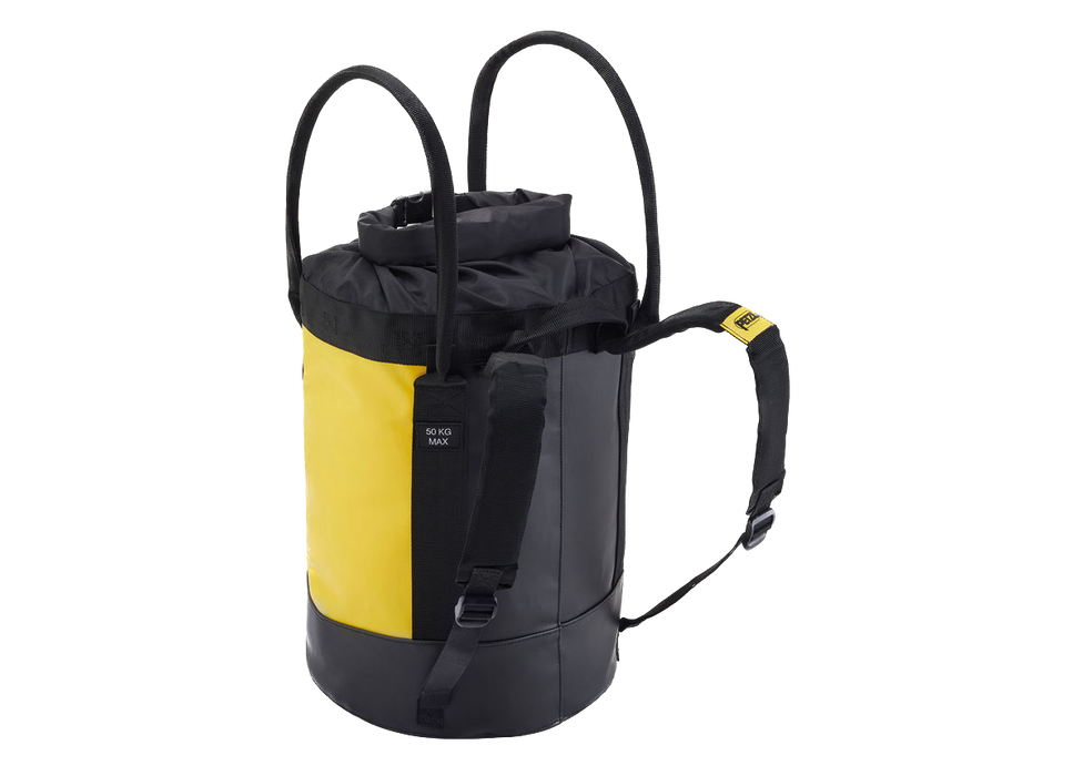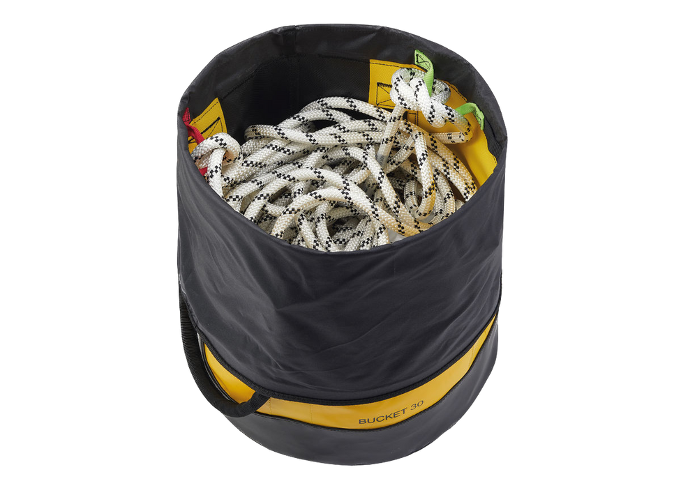 For those who want a simple yet durable means of storage, Petzl's Bucket 30 rope bag allows you to store up to 110 meters of 11 mm diameter rope. It remains upright and keeps its shape, even when empty, for easy access to the inside of the bag. It has padded shoulder straps for comfort, an exterior pocket to store personal items, and a marking area for quick identification of the contents of the bag. Its construction of TPU tarp material allows regular to intensive use.